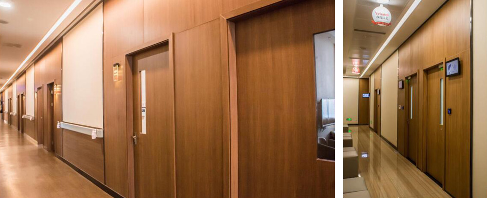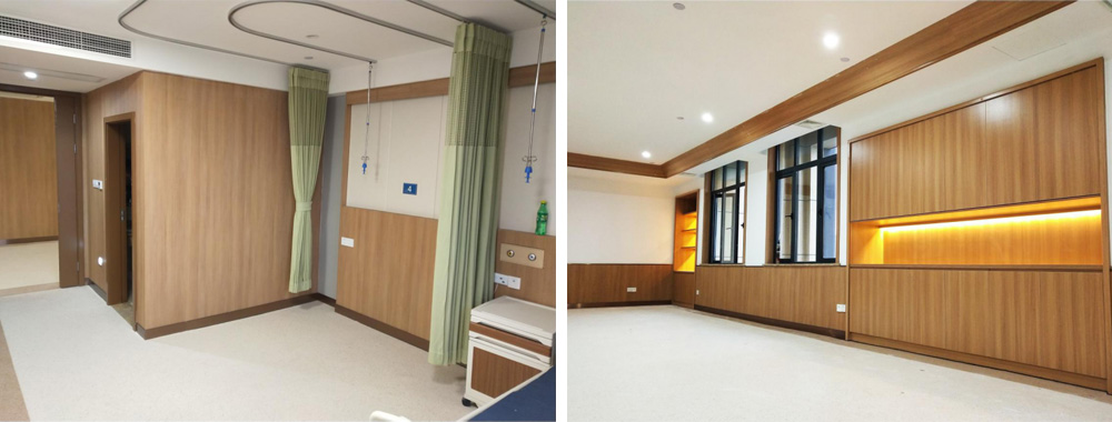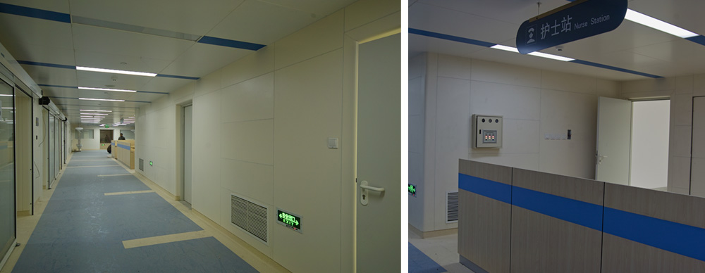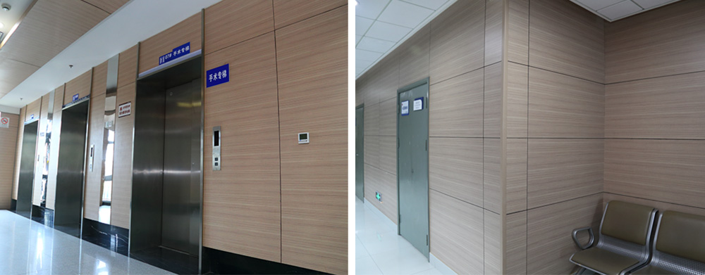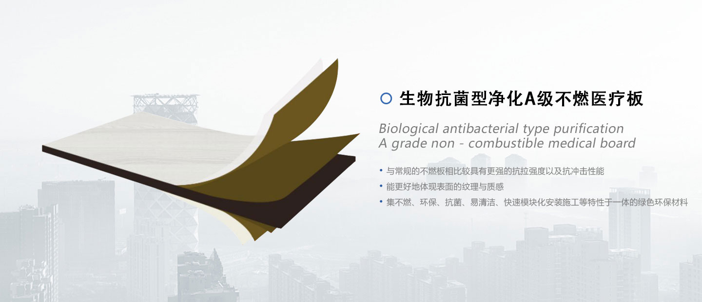 生物抗菌型凈化A級不燃醫療板是由高密度無機芯材加上含浸酚醛樹脂的高強度牛皮紙,以及含浸三聚氰胺樹脂的裝飾紙、表層紙經專用設備高溫高壓壓制而成。與常規的不燃板相比較具有更強的抗拉強度以及抗沖擊性能,同時能更好地體現表面的紋理與質感。