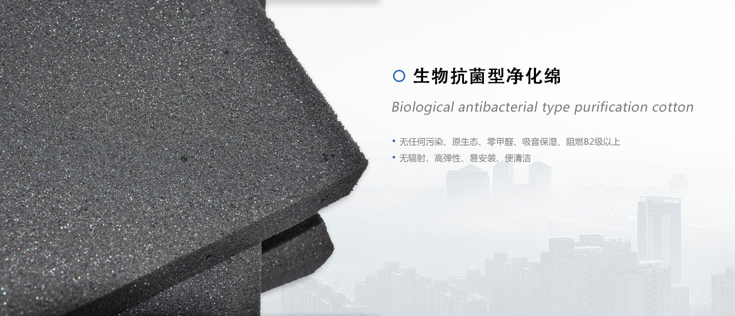 生物抗菌型凈化綿采用多種進口生物型凈化材料發泡而成,可以循環持久的凈化空氣中的甲醛、甲苯、TVOC、PM2.5,同時產生一定濃度的負氧離子(表面負氧離子濃度100-500個/CM3),可使室內空氣中負氧離子濃度達到500-3000個/CM3,因亦可提供負氧離子,同時又可稱為生態負氧型凈化綿。對人體腦神經具有舒緩作用,同時提高免疫力和抗病能力,使人感到輕松愉快、振奮精神、充滿活力。